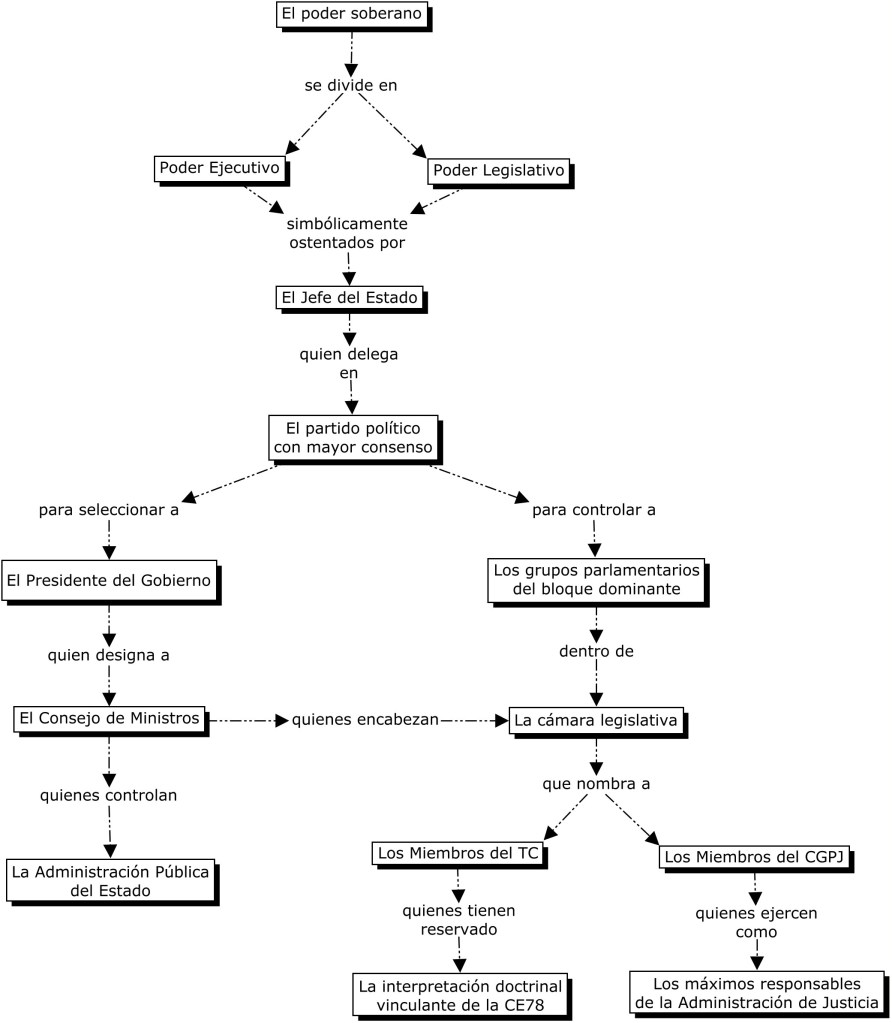 1. No hay separación de poderes: el órgano de mando de un mismo partido elige a los miembros del Gobierno y a los integrantes del grupo parlamentario dominante de la cámara legislativa, de modo que el legislativo queda siempre subordinado al ejecutivo por la jerarquía interna del propio partido. La apariencia de una separación de poderes es creada mediante el discurso político confundiendo separación con la mera división conceptual del poder soberano en dos.